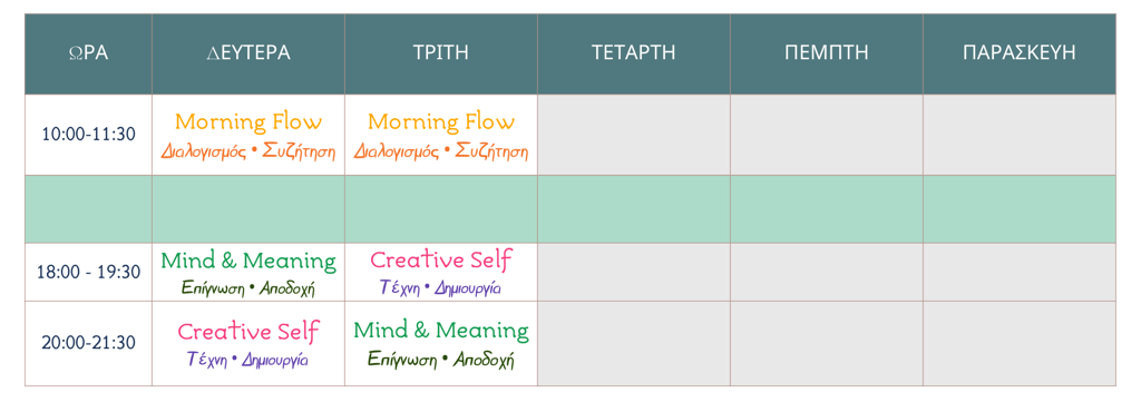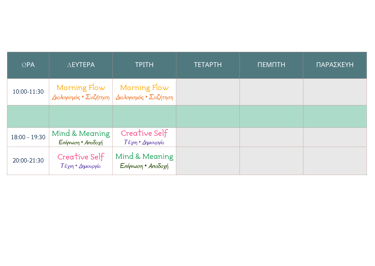 Morning Flow: Μια ήπια, ζεστή έναρξη της ημέρας, με διαλογισμό, αναπνοές και ασκήσεις ήπιας ενεργοποίησης. Μέσα από μικρές συζητήσεις και μοίρασμα προθέσεων, δημιουργούμε χώρο για σύνδεση, εστίαση και ένα ουσιαστικό ξεκίνημα με παρουσία και ενσυναίσθηση.(Διαλογισμός, Συμβουλευτική, CBT, Gestalt)